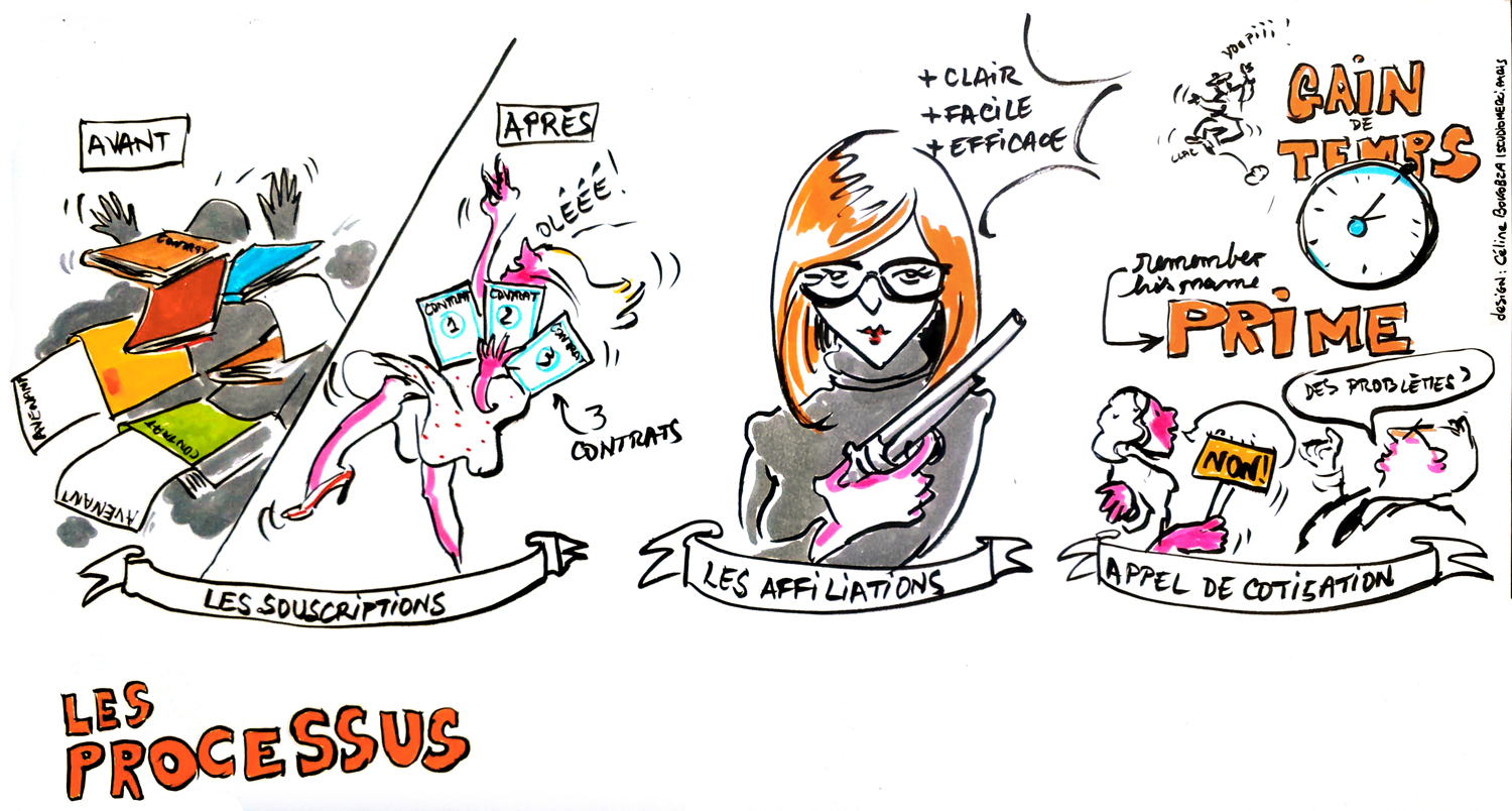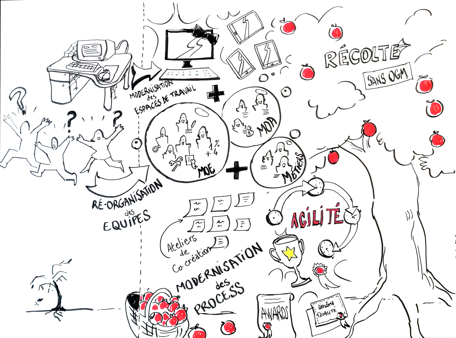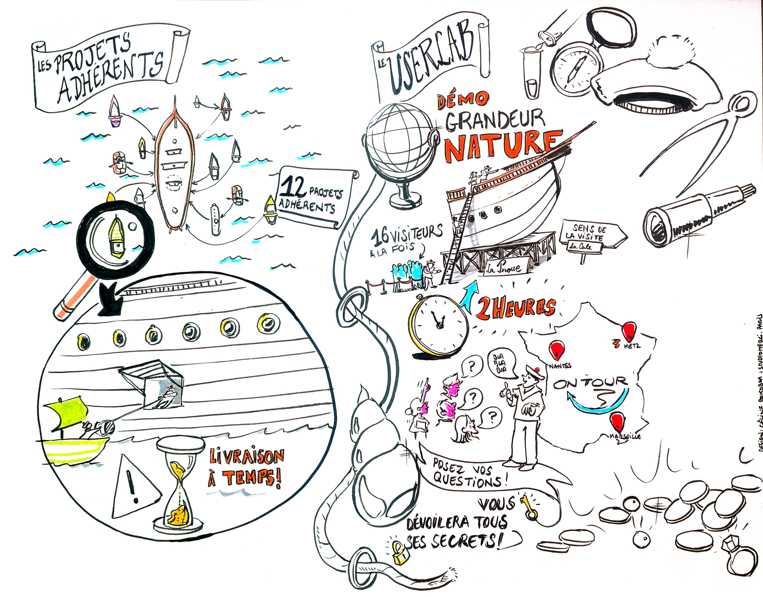Réalisé en direct de la séance de travail, le dessin permet de guider le groupe dans le cheminement de sa réflexion puis de communiquer sur l’avancement de son projet auprès des autres entités.
